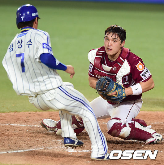 3회말 삼성 공격 2사 1, 3루 상황 넥센 포수 박동원이 선발 문성현의 원바운드 공을 블로킹 할 때 홈을 파고든 김상수가 공을 다시 잡아낸 박동원에게 태그아웃되고 있다.