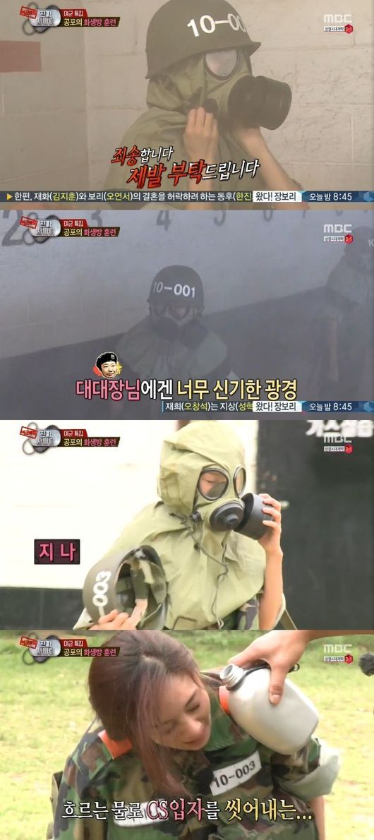 가수 지나가 방독면을 제대로 착용하지 못해 훈련을 시작하기도 전 화생방 훈련장을 탈출했다.