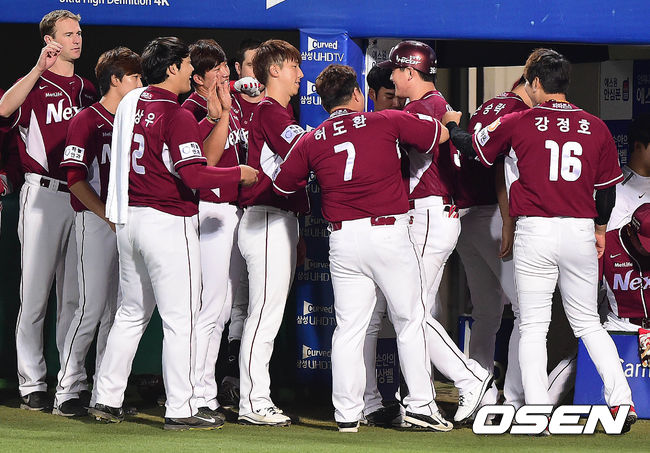 5회초 넥센 공격 선두타자로 나선 이성열이 좌월 솔로포를 날리고 홈을 밟은 뒤 더그아웃 동료들과 인사를 나누고 있다.