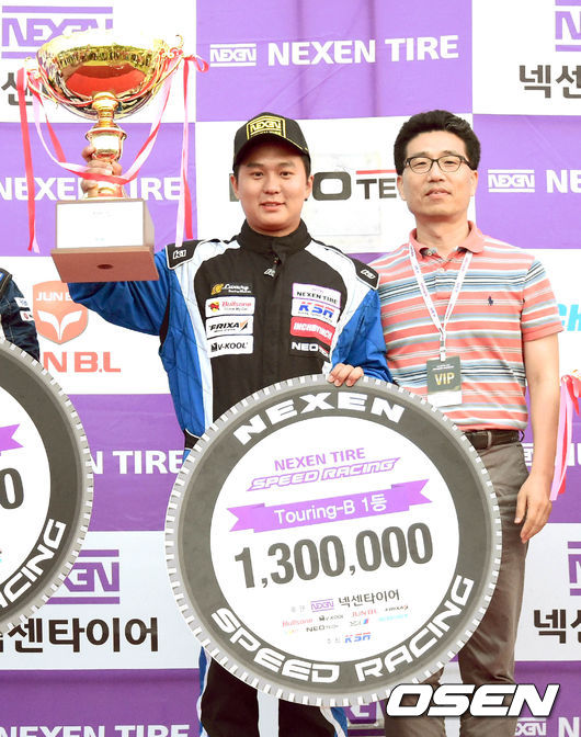 투어링B 우승 박준범이 넥센타이어 컴파운드 개발팀 김종명 팀장과 우승 트로피를 높이 치켜들고 있다./spjj@osen.co.kr
