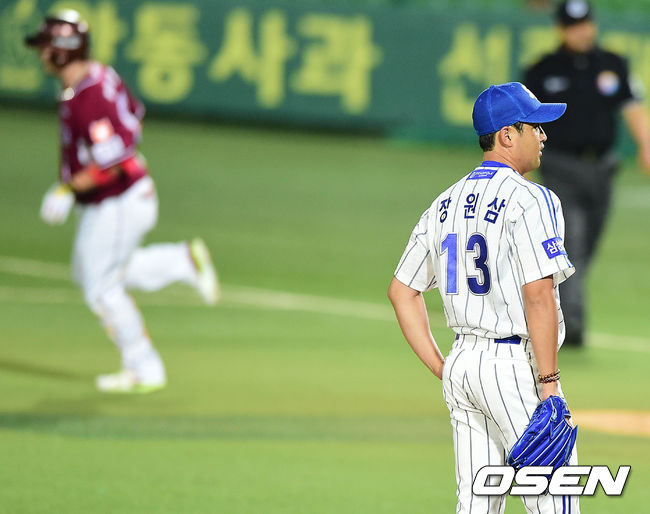 6회초 넥센 공격 1사 주자없는 상황 박병호에게 우월 솔로포를 허용한 삼성 선발 장원삼이 아쉬워하고 있다.