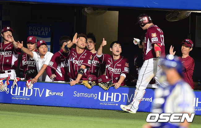 6회초 넥센 공격 1사 주자없는 상황 박병호가 우월 솔로포를 날리고 홈을 밟은 뒤 더그아웃 동료들과 인사를 나누고 있다.