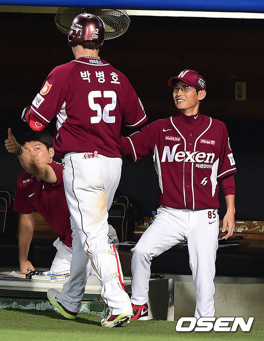 6회초 넥센 공격 1사 주자없는 상황 박병호가 우월 솔로포를 날리고 홈을 밟은 뒤 염경엽 감독과 인사를 나누고 있다.