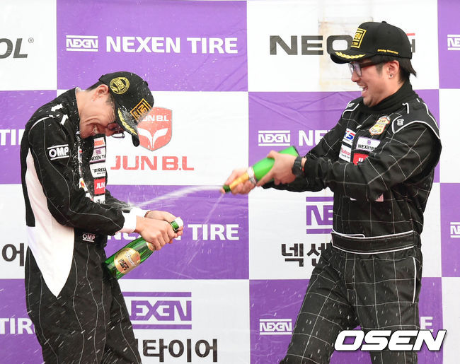 TT 100B 우승자 박종필이 2위를 차지한 구본승에게 샴페인을 뿌리고 있다./spjj@osen.co.kr