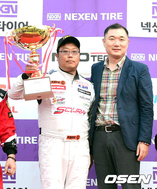 TT 100A 우승자 이형탁이 넥센타이어 상품기획팀 박기석 팀장과 함께 우승 트로피를 높이 치켜들고 있다./spjj@osen.co.kr