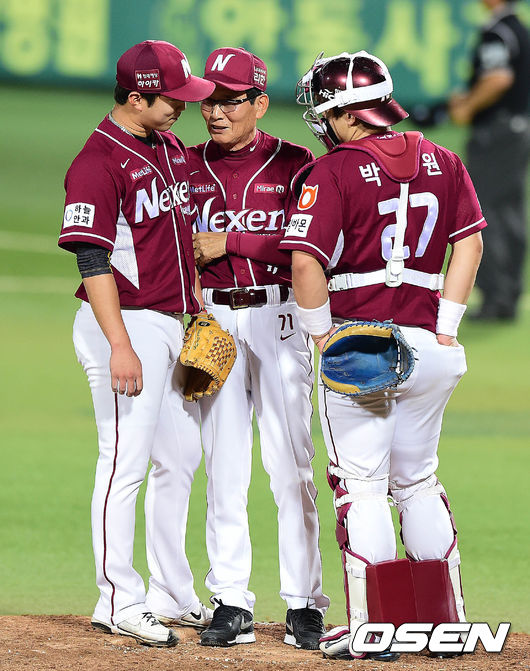 7회말 삼성 공격 2사 1루 상황 넥센 선발 문성현이 마운드를 내려가며 류영수 코치와 대화를 나누고 있다.