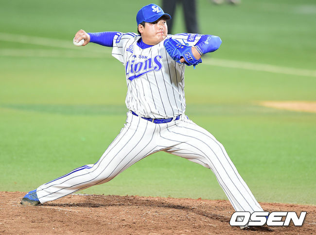 8회초 넥센 공격 무사 1, 3루 상황 마운드에 오른 삼성 투수 김현우가 힘차게 공을 뿌리고 있다.