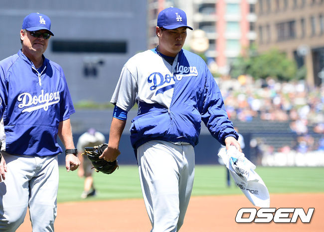 1일(이하 한국시간) 미국 캘리포니아주 샌디에이고 펫코 파크에서 열릴 '2014 메이저리그' 샌디에이고 파드리스와 LA 다저스의 경기에 앞서 다저스 류현진이 불펜 훈련을 마치고 더그아웃으로 가고 있다.