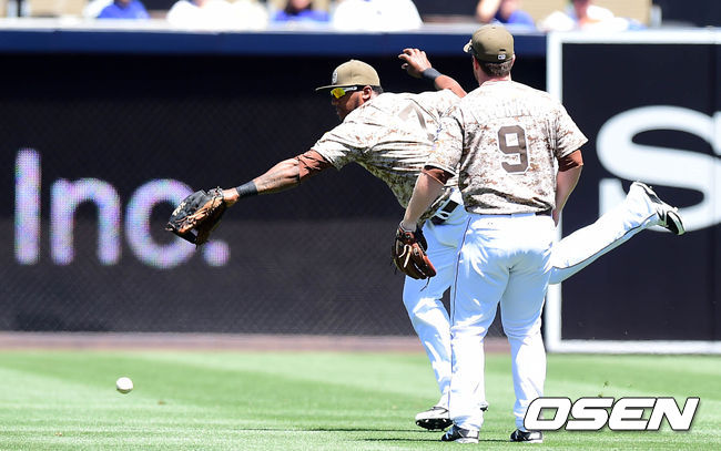1일(이하 한국시간) 미국 캘리포니아주 샌디에이고 펫코 파크에서 열린 '2014 메이저리그' 샌디에이고 파드리스와 LA 다저스의 경기, 1회초 무사에서 샌디에이고 리리아노가 다저스 푸이그의 타구를 놓치며 2루타를 허용하고 있다.