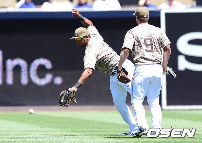 1일(이하 한국시간) 미국 캘리포니아주 샌디에이고 펫코 파크에서 열린 '2014 메이저리그' 샌디에이고 파드리스와 LA 다저스의 경기, 1회초 무사에서 샌디에이고 리리아노가 다저스 푸이그의 타구를 놓치며 2루타를 허용하고 있다.