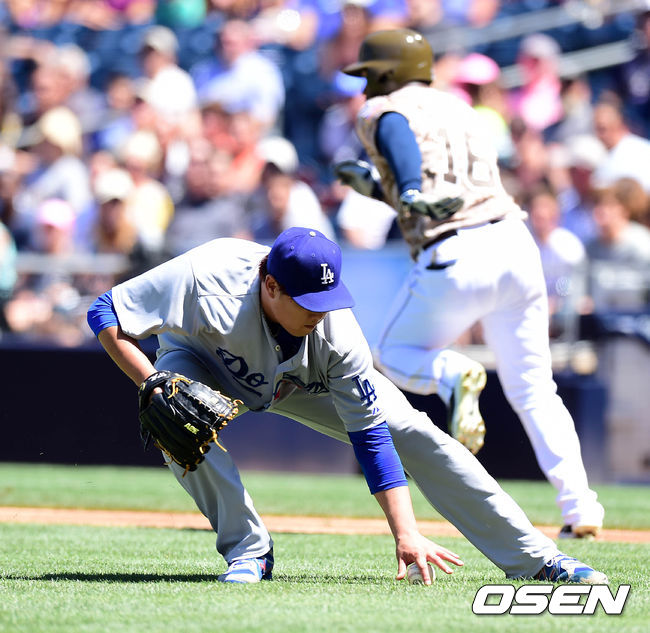 1일(이하 한국시간) 미국 캘리포니아주 샌디에이고 펫코 파크에서 열린 '2014 메이저리그' 샌디에이고 파드리스와 LA 다저스의 경기, 1회말 무사 2루에서 다저스 류현진이 샌디에이고 알몬테의 번트 타구를 처리하고 있다.