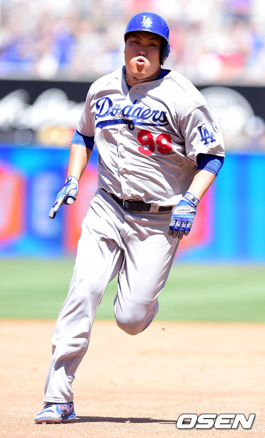 1일(이하 한국시간) 미국 캘리포니아주 샌디에이고 펫코 파크에서 열린 '2014 메이저리그' 샌디에이고 파드리스와 LA 다저스의 경기, 3회초 1사 1,2루에서 다저스 2루주자 류현진이 곤잘레스의 중전안타때 3루로 달리고 있다.