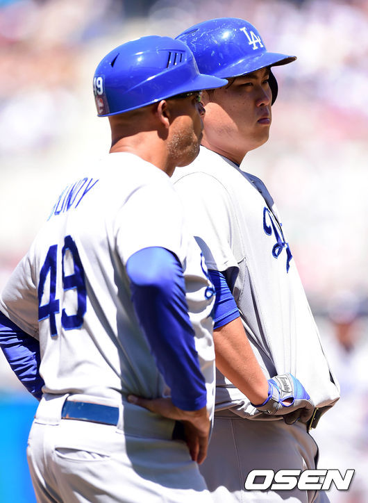 1일(이하 한국시간) 미국 캘리포니아주 샌디에이고 펫코 파크에서 열린 '2014 메이저리그' 샌디에이고 파드리스와 LA 다저스의 경기, 3회초 1사 1,2루에서 다저스 곤잘레스의 중전안타때 3루를 밟은 류현진이 주루코치와 이야기를 나누고 있다.