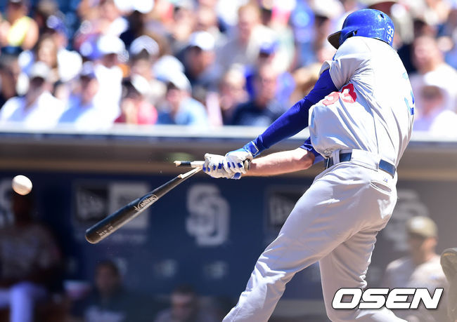 1일(이하 한국시간) 미국 캘리포니아주 샌디에이고 펫코 파크에서 열린 '2014 메이저리그' 샌디에이고 파드리스와 LA 다저스의 경기, 1회초 2사 1,2루에서 다저스 밴 슬라이크가 우전 적시타를 치고 있다.