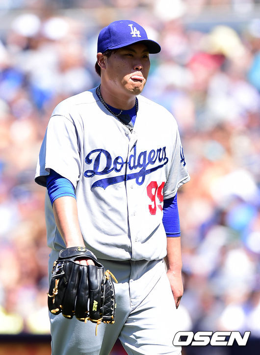 1일(이하 한국시간) 미국 캘리포니아주 샌디에이고 펫코 파크에서 열린 '2014 메이저리그' 샌디에이고 파드리스와 LA 다저스의 경기, 3회말 2사에서 다저스 류현진이 샌디에이고 알몬테를 외야플라이로 처리하고 더그아웃으로 가고 있다.