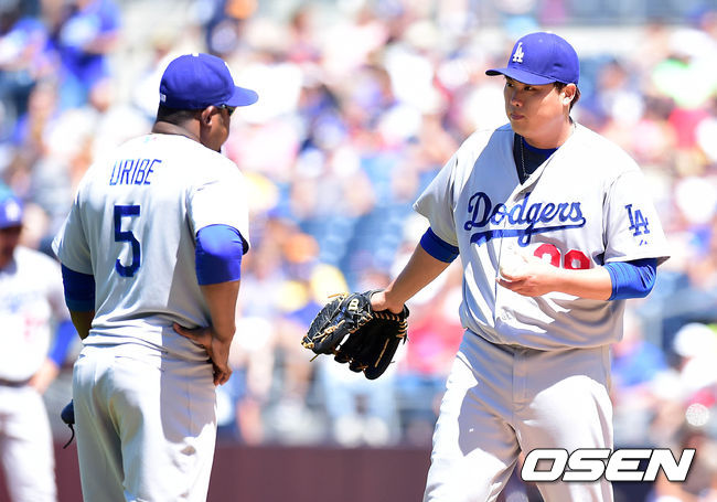 1일(이하 한국시간) 미국 캘리포니아주 샌디에이고 펫코 파크에서 열린 '2014 메이저리그' 샌디에이고 파드리스와 LA 다저스의 경기, 3회말 1사에서 다저스 류현진이 샌디에이고 솔라르테를 내야땅볼로 처리하고 유리베와 이야기를 나누고 있다.