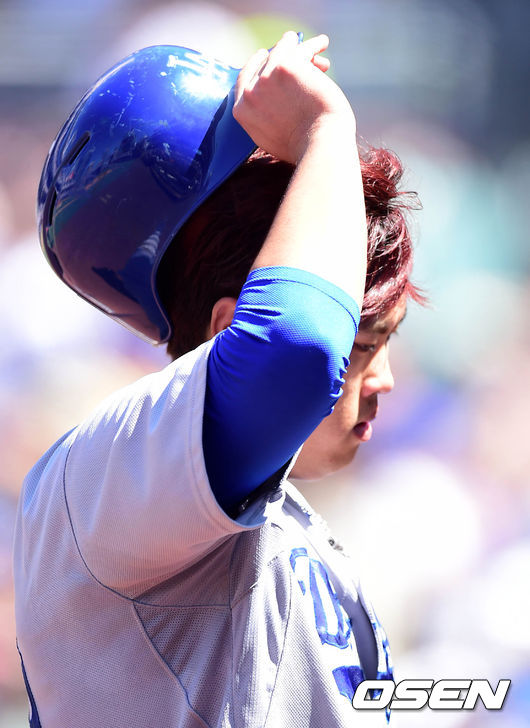 1일(이하 한국시간) 미국 캘리포니아주 샌디에이고 펫코 파크에서 열린 '2014 메이저리그' 샌디에이고 파드리스와 LA 다저스의 경기, 4회초 2사 1루에서 다저스 류현진이 내야땅볼로 물러나며 아쉬운 표정을 짓고 있다.
