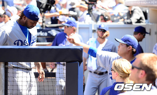 1일(이하 한국시간) 미국 캘리포니아주 샌디에이고 펫코 파크에서 열린 '2014 메이저리그' 샌디에이고 파드리스와 LA 다저스의 경기, 4회말 2사에서 샌디에이고 리리아노를 외야플라이로 처리한 다저스 류현진이 더그아웃에서 라미레즈와 하이파이브를 하고 있다.