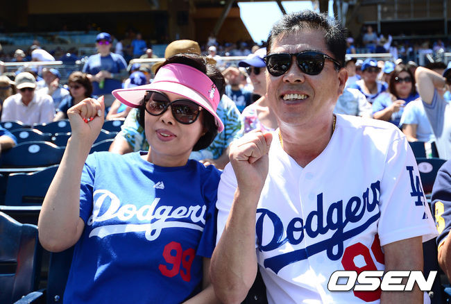 1일(이하 한국시간) 미국 캘리포니아주 샌디에이고 펫코 파크에서 열린 '2014 메이저리그' 샌디에이고 파드리스와 LA 다저스의 경기, 다저스 류현진의 부모님이 관중석에서 류현진을 응원하고 있다.