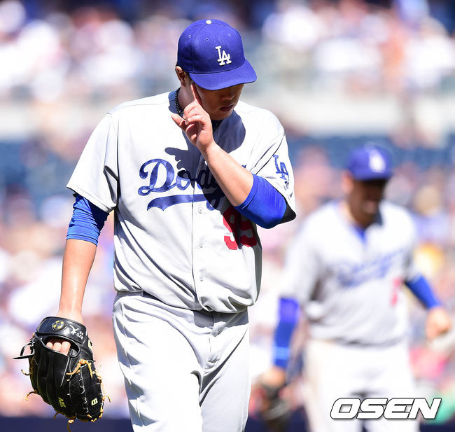 1일(이하 한국시간) 미국 캘리포니아주 샌디에이고 펫코 파크에서 열린 '2014 메이저리그' 샌디에이고 파드리스와 LA 다저스의 경기, 7회말 1사 1루에서 샌디에이고 메이빈을 병살타로 처리한 다저스 류현진이 더그아웃으로 가고 있다.