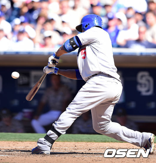 1일(이하 한국시간) 미국 캘리포니아주 샌디에이고 펫코 파크에서 열린 '2014 메이저리그' 샌디에이고 파드리스와 LA 다저스의 경기, 8회초 무사 만루에서 다저스 유리베가 우전 적시타를 치고 있다.