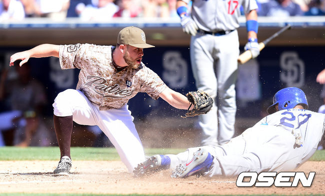 1일(이하 한국시간) 미국 캘리포니아주 샌디에이고 펫코 파크에서 열린 '2014 메이저리그' 샌디에이고 파드리스와 LA 다저스의 경기, 8회초 무사 만루에서 샌디에이고 토레스의 폭투때 홈으로 쇄도한 다저스 3루주자 켐프가 태그를 피해 세이프되고 있다.