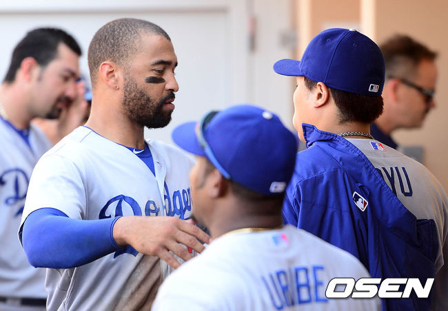 1일(이하 한국시간) 미국 캘리포니아주 샌디에이고 펫코 파크에서 열린 '2014 메이저리그' 샌디에이고 파드리스와 LA 다저스의 경기, 8회초 무사 1,2에서 다저스 이디어와 교체된 류현진이 더그아웃에서 켐프와 하이파이브를 하고 있다.