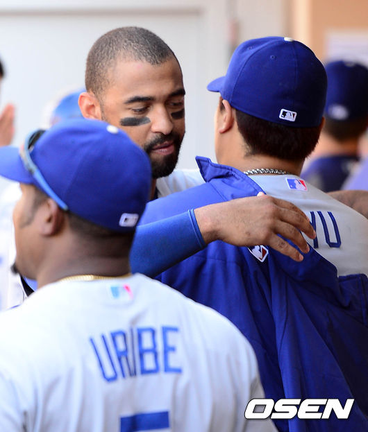 1일(이하 한국시간) 미국 캘리포니아주 샌디에이고 펫코 파크에서 열린 '2014 메이저리그' 샌디에이고 파드리스와 LA 다저스의 경기, 8회초 무사 1,2에서 다저스 이디어와 교체된 류현진이 더그아웃에서 켐프와 하이파이브를 하고 있다.