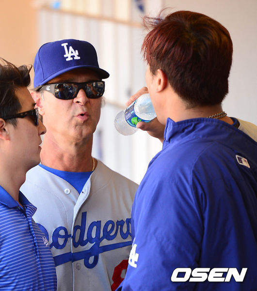 1일(이하 한국시간) 미국 캘리포니아주 샌디에이고 펫코 파크에서 열린 '2014 메이저리그' 샌디에이고 파드리스와 LA 다저스의 경기, 8회초 무사 1,2에서 다저스 이디어와 교체된 류현진이 더그아웃에서 매팅리 감독과 이야기를 나누고 있다.
