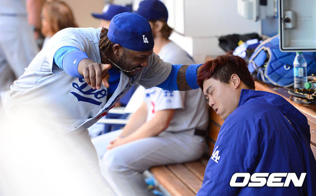 1일(이하 한국시간) 미국 캘리포니아주 샌디에이고 펫코 파크에서 열린 '2014 메이저리그' 샌디에이고 파드리스와 LA 다저스의 경기, 8회초 무사 1,2에서 다저스 이디어와 교체된 류현진이 더그아웃에서 라미레즈와 장난을 치고 있다.