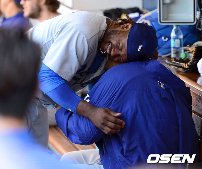 1일(이하 한국시간) 미국 캘리포니아주 샌디에이고 펫코 파크에서 열린 '2014 메이저리그' 샌디에이고 파드리스와 LA 다저스의 경기, 8회초 무사 1,2에서 다저스 이디어와 교체된 류현진이 더그아웃에서 라미레즈와 장난을 치고 있다.