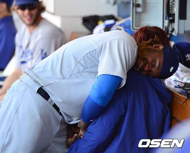 1일(이하 한국시간) 미국 캘리포니아주 샌디에이고 펫코 파크에서 열린 '2014 메이저리그' 샌디에이고 파드리스와 LA 다저스의 경기, 8회초 무사 1,2에서 다저스 이디어와 교체된 류현진이 더그아웃에서 라미레즈와 장난을 치고 있다.