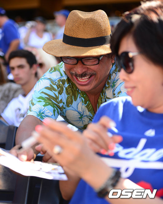 1일(이하 한국시간) 미국 캘리포니아주 샌디에이고 펫코 파크에서 열린 '2014 메이저리그' 샌디에이고 파드리스와 LA 다저스의 경기, 다저스의 한 남성팬이 류현진 어머니에게 사인을 요청하고 있다.