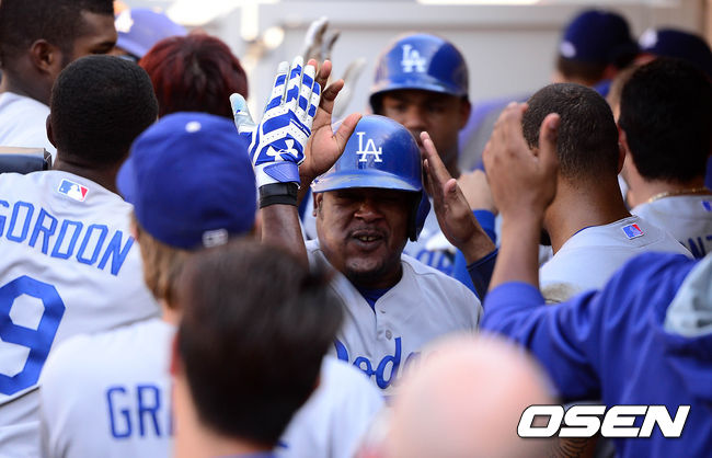 8회초 무사 만루에서 다저스 바니의 2타점 적시타때 홈을 밟은 2루루자 유리베가 더그아웃에서 동료들과 환호하고 있다. /jpnews@osen.co.kr