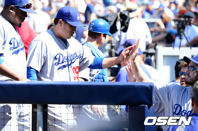 7회말 1사 1루에서 샌디에이고 메이빈을 병살타로 처리한 다저스 류현진이 더그아웃으로 가며 동료들과 하이파이브를 하고 있다. /jpnews@osen.co.kr