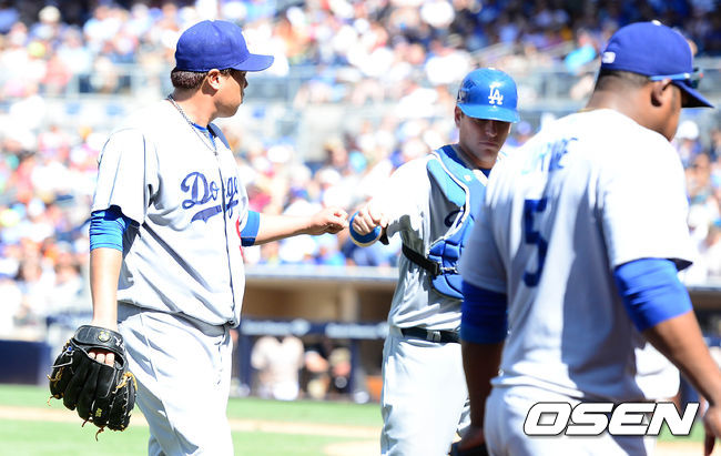 7회말 1사 1루에서 샌디에이고 메이빈을 병살타로 처리한 다저스 류현진이 더그아웃으로 가며 동료들과 하이파이브를 하고 있다. /jpnews@osen.co.kr