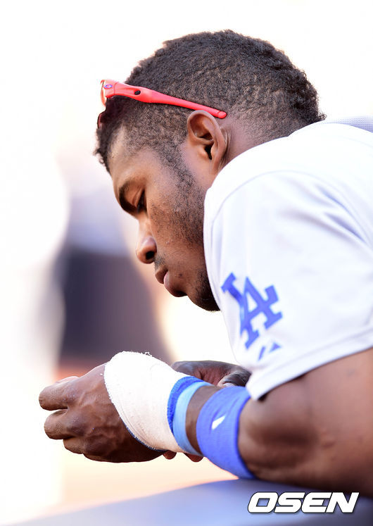 경기 종료 후 다저스 푸이그가 더그아웃에서 붕대를 감은 손을 바라보고 있다. /jpnews@osen.co.kr