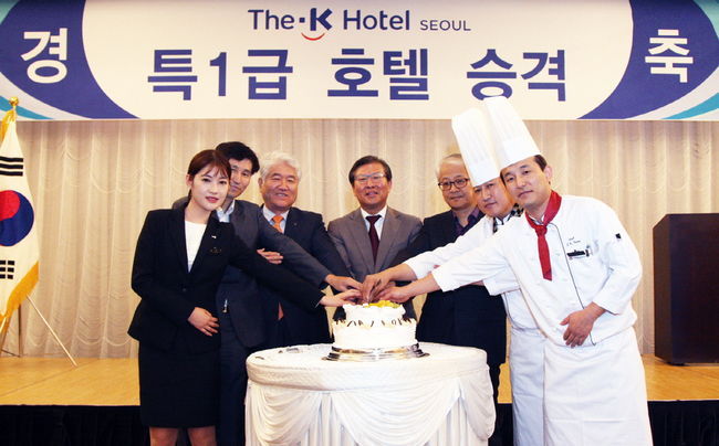 The-K호텔서울 특 1급 승격 기념 행사. 가운데가 강병직 사장이다. /The-K호텔서울 제공.