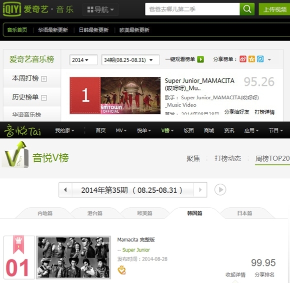 더불어 지난 28일 공개된 슈퍼주니어 정규 7집 타이틀 곡 'MAMACITA(아야야)' 뮤직비디오는 중국 온라인 동영상 사이트 아이치이(奇)와 중국 음악 사이트 인위에타이 V차트에서 뮤직비디오 주간차트(8월 25일~8월 31일) 한국어 부문 1위를 차지, 글로벌 한류 제왕의 저력을 과시했다.