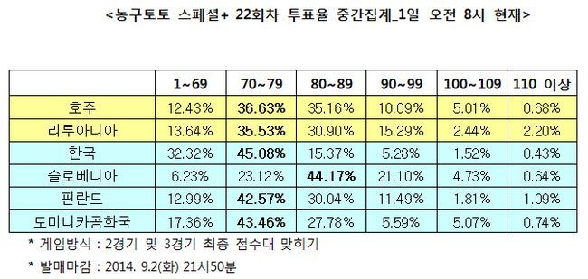 2014 FIBA 농구월드컵 3경기 대상 농구토토 스페셜+ 22회차 투표율 중간집계 결과
