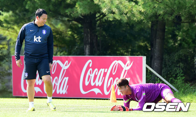 이운재 코치가 노동건과 이야기를 나누고 있다.