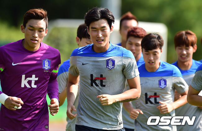 대표팀 장현수가 김승규와 이야기를 나누며 러닝을 하고 있다.
