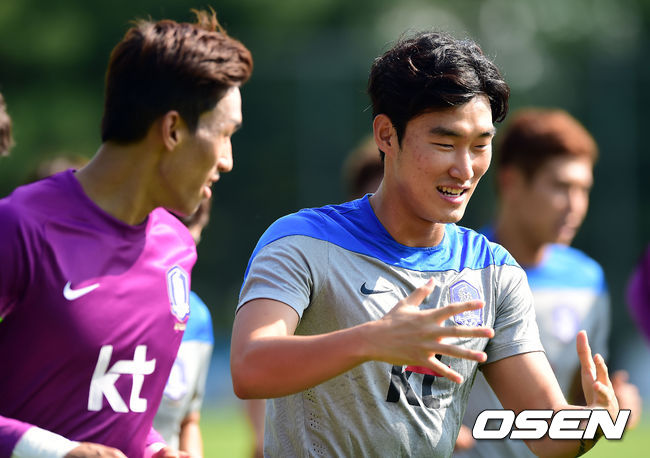 대표팀 장현수가 김승규와 이야기를 나누며 러닝을 하고 있다.