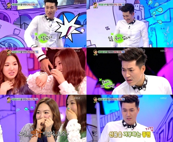 김종민은 1일 오후 방송된 KBS 2TV 예능프로그램 '대국민 토크쇼 안녕하세요'에 출연해 MC들과 함께 사연을 보낸 가족들의 고민을 나눴다.