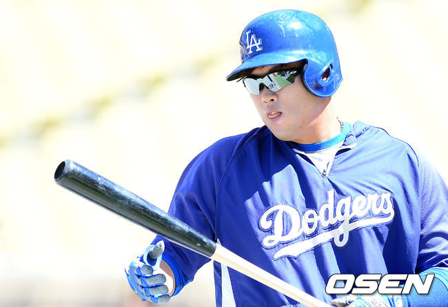 경기에 앞서 다저스 류현진이 타격 훈련을 마치고 배트를 바라보고 있다.