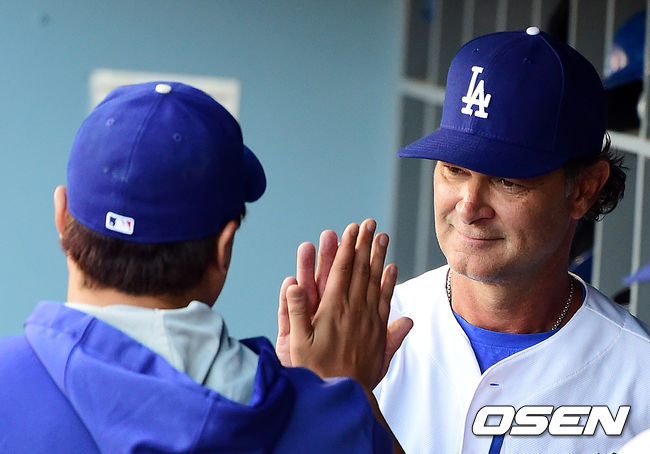 경기에 앞서 다저스 류현진이 매팅리 감독과 하이파이브를 하고 있다.