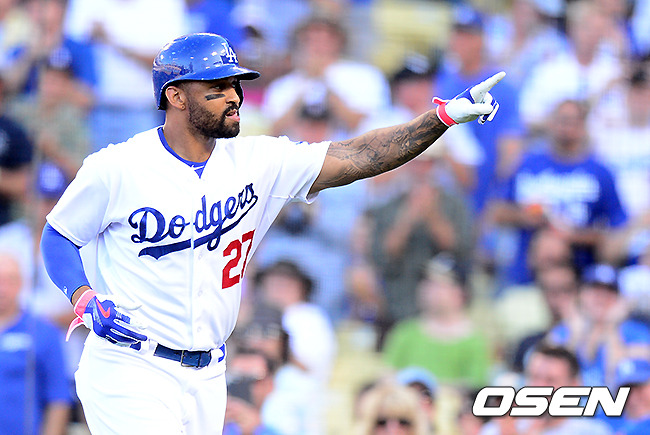 1회말 2사 1루에서 다저스 맷 켐프가 역전 투런포를 날리고 홈을 밟으며 기뻐하고 있다.