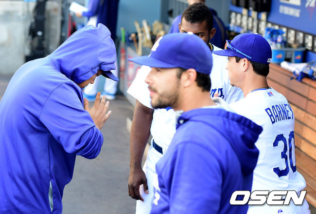 경기에 앞서 다저스 류현진이 푸이그, 바니와 이야기를 나누고 있다.