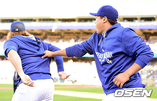 경기에 앞서 다저스 류현진이 터너와 장난을 치고 있다.