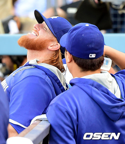 경기에 앞서 다저스 류현진이 터너와 장난을 치고 있다.